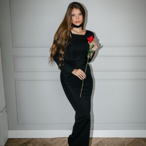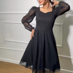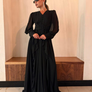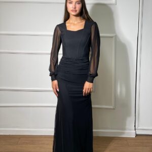 שמלת ערב צנועה צבע שחור דגם מלמלה ניתן לסגור פתחים בד מחטב ואוסף