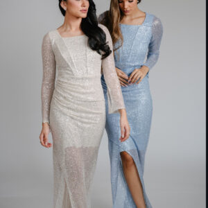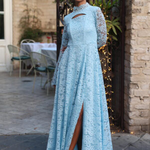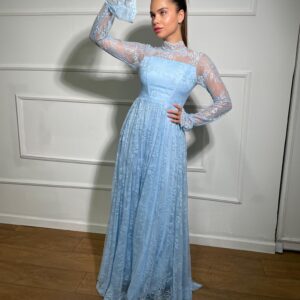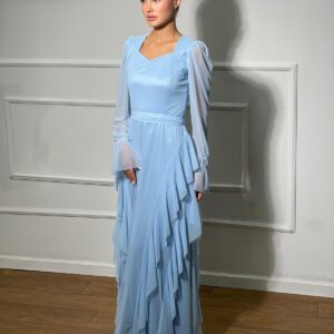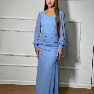מאיה חן אופנה צנועה – שמלת ערב בד נצנץ עדין בצבע תכלת