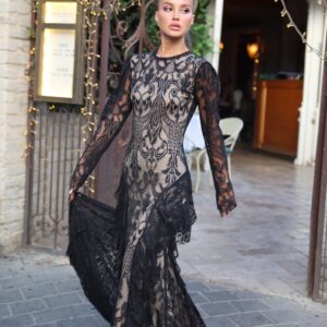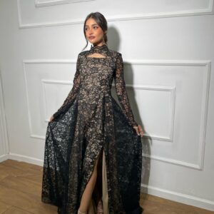 שמלת ערב לי – שמלה מחטבת בצבע שחור מגיעה עם דנטל תחרה בסיומת השרוול