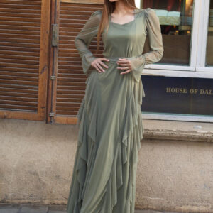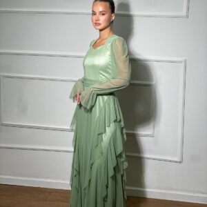 שמלת ערב מקסי שיפון צנועה מלמלה צבע ירוק בהיר נסיכותי