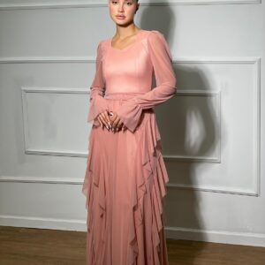 שמלת ערב מקסי שיפון צנועה מלמלה צבע ורוד בהיר נסיכותי