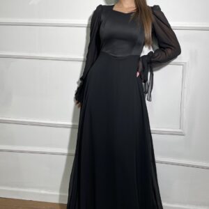 מאיה חן אופנה צנועה – שמלת ערב שחורה מקסי בד שיפון עם תחרה מגיעה עם תחתית