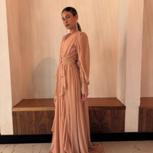 שמלת ערב צנועה מקסי גזרה נשפכת בצבע ורדרד פתח וי מראה קלאסי ואצילי