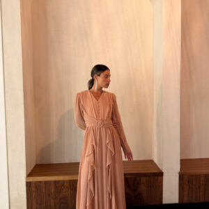 מאיה חן אופנה צנועה – שמלת ערב מקסי בצבע ורוד נשפכת בד מנצנץ עם חגורה ניתן לסגור פתחים
