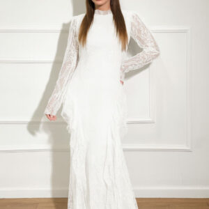 מאיה חן אופנה צנועה – שמלת ערב מקסי בצבע לבן בגזרה נשפכת עם תחרה מגיעה עם בטנה מתחת אטומה